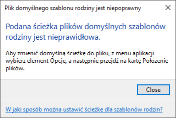 Uwaga: Usunięcie pakietów zawartości istotnej może spowodować, że program Revit będzie wyświetlał następujący komunikat z powodu braku szablonów rodzin w ich ścieżce określonej w pliku Revit.ini.