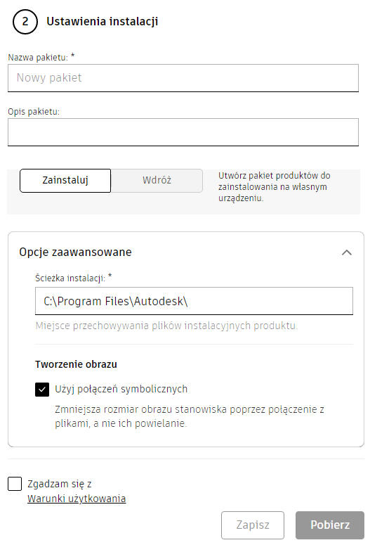 Po ukończeniu konfigurowania wybierz opcję Zainstaluj, aby pobrać dostosowaną instalację programu Revit i rozpocząć instalację.