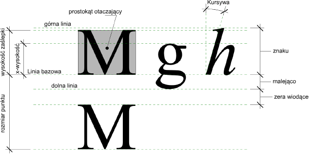 Wielkość tekstu jest teraz raportowany przy użyciu wysokości wielkich liter, uzyskiwanej drogą pomiary od linii bazowej do szczytu wielkiej litery M. Należy koniecznie pamiętać, że wiele znaków alfabetów azjatyckich jest nieco wyższych od wielkiej litery M, więc owe znaki będą wydawały się wyższe od wartości parametru Rozmiar tekstu dla czcionek alfabetów zachodnich. Dopasuj parametr Rozmiar tekstu, aby znaki miały żądaną wysokość.