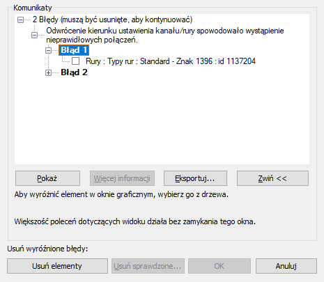 - Wybierz nagłówek komunikatu o błędzie, np. Błąd 1. Wszystkie elementy związane z tym błędem zostaną zaznaczone w obszarze rysunku.