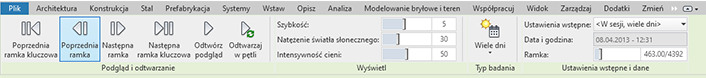Na pasku sterowania widokiem kliknij ikonę (Włącz cienie) i opcję (Trajektoria słońca włączona), a następnie z menu kontekstowego wybierz pozycję Analiza oświetlenia naturalnego.