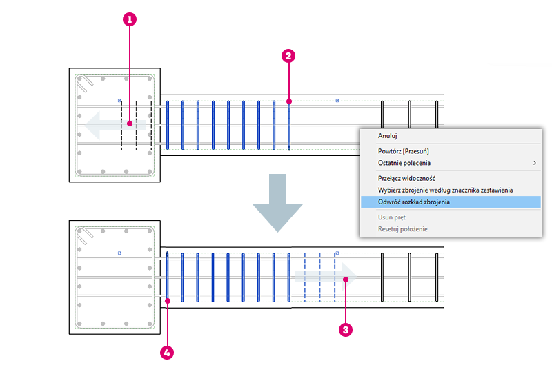 Aby wybrać kierunek rozwinięcia rozkładu zbrojenia, użyj opcji odwracania w menu kontekstowym.