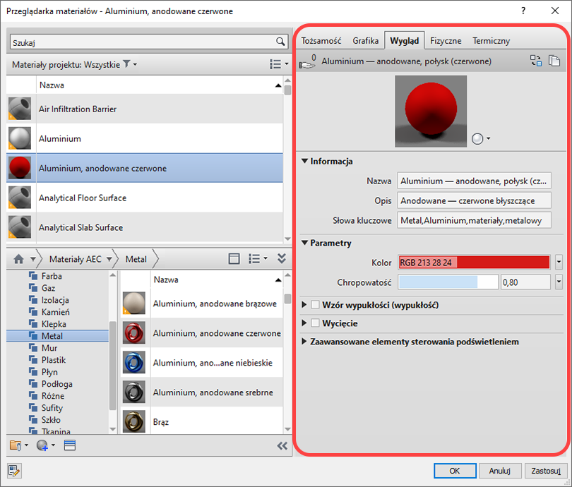 W Przeglądarce materiałów te informacje są wyświetlane na kartach Identyfikacja, Grafika i Wygląd w panelu Edytor materiałów.