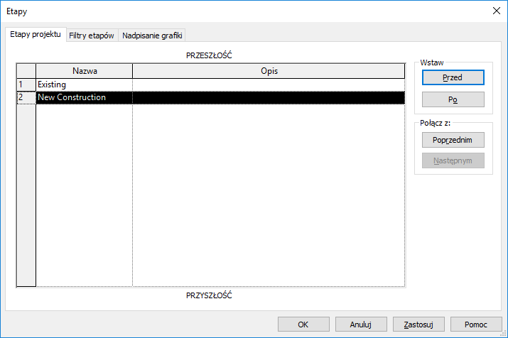 Zostanie otwarte okno dialogowe Etapy wyświetlające zakładkę Etapy projektu. Domyślnie w każdym projekcie istnieją etapy o nazwach Istniejący i Nowa budowa.