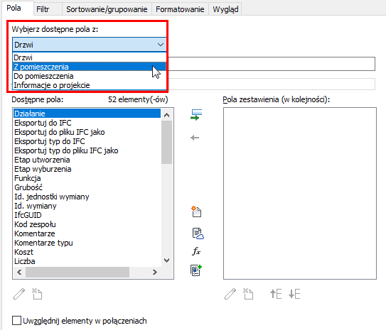 - Na karcie Pola dla opcji Wybierz dostępne pola z listy rozwijanej kliknij pozycję Z pomieszczenia lub Do pomieszczenia.