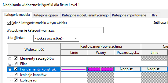 Na poniższej ilustracji kategoria Słupy ma nadpisania dla linii i wzorów rzutowania/powierzchni.