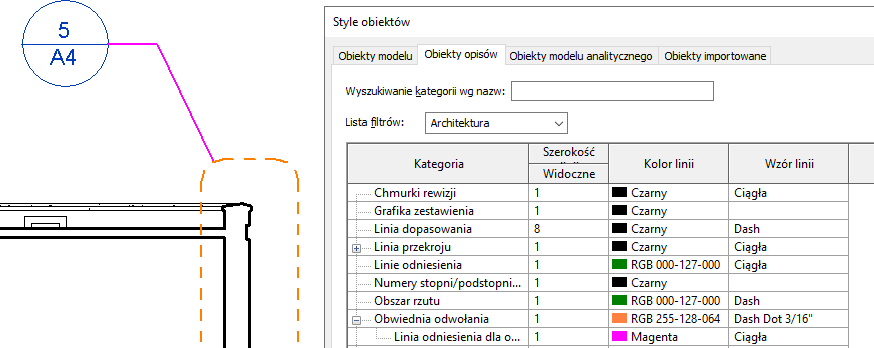 Można sterować szerokością, kolorem oraz wzorem linii używanych w znacznikach odwołania i liniach odniesienia. Ustawienia określone w tym miejscu mają zastosowanie do wszystkich odwołań w projekcie.