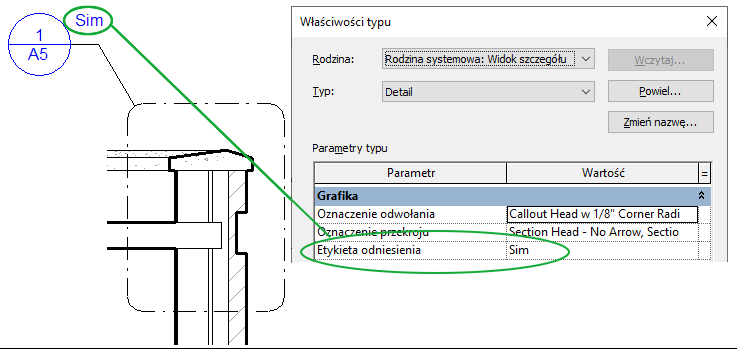 Istnieje możliwość zmiany sposobu wyświetlania oznaczenia odniesienia w oznaczeniu odwołania. Można także zmienić lub dodać szczegół odniesienia lub numery arkuszy do symbolu odwołania. W tym celu należy utworzyć rodzinę symboli odwołania i dodać etykiety zawierające te parametry.