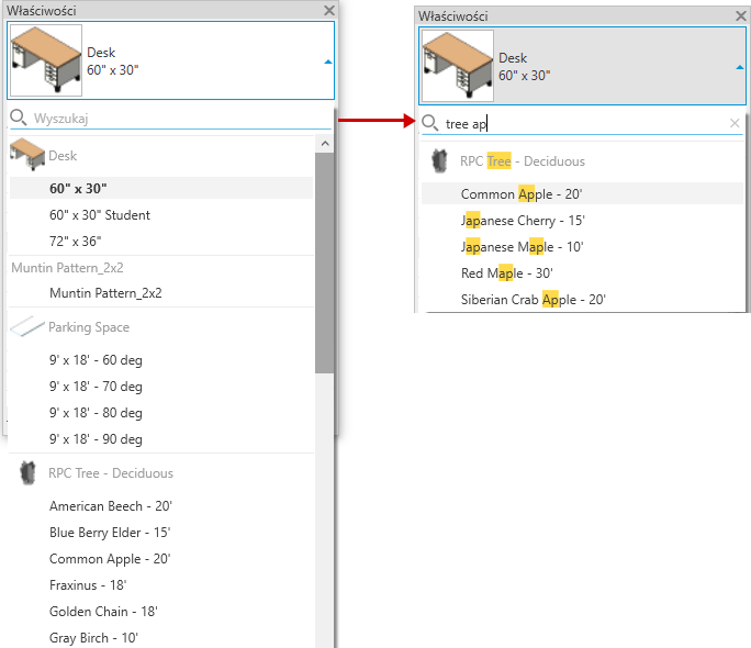 Revit LT udostępniono funkcję wyszukiwania, aby ułatwić wybór z długiej listy opcji. Można wyszukiwać w następujących obszarach funkcyjnych:
