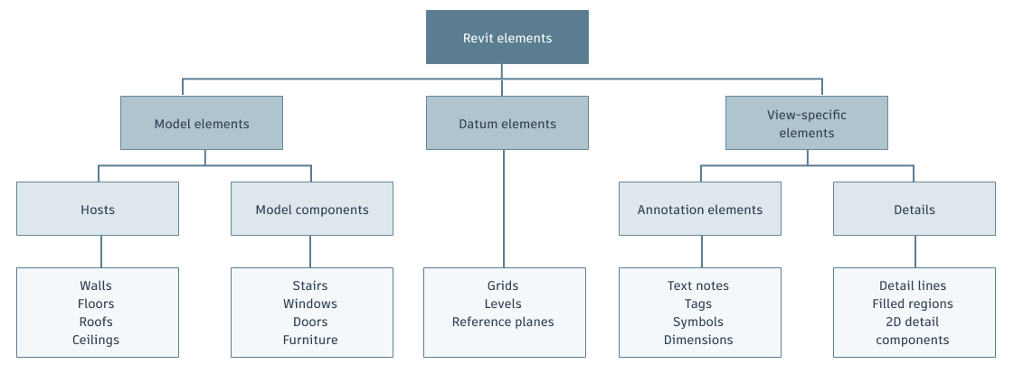 W programie Revit LT używane są w projektach 3 typy elementów: elementy modelu, elementy odniesienia i elementy charakterystyczne dla danego widoku. Elementy w programie Revit LT są również nazywane rodzinami. Rodzina zawiera definicję geometryczną elementu i parametry używane przez element. Każde wystąpienie elementu jest definiowane i kontrolowane przez rodzinę.