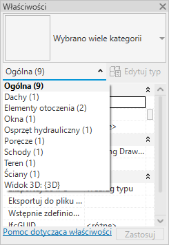 Tuż pod polem Wybór typu znajduje się filtr określający kategorię elementów, które będą umieszczane za pomocą narzędzia, lub kategorię i liczbę elementów wybranych w obszarze rysunku. W przypadku wybrania wielu kategorii lub typów w palecie są wyświetlane tylko ich wspólne właściwości elementu. Aby zobaczyć właściwości konkretnej kategorii lub widoku, gdy wybrano wiele kategorii, należy użyć listy rozwijanej filtru. Wybranie jednej kategorii nie wpływa na inne wybrane elementy.