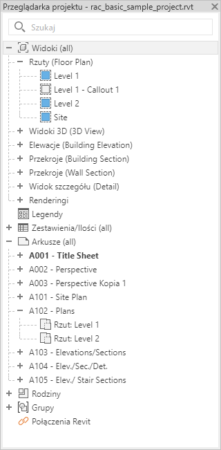 Możesz dostosować organizację widoków, arkuszy i zestawień/ilości w Przeglądarce projektu zgodnie ze swoim sposobem pracy. Zobacz Organizowanie Przeglądarki projektu.