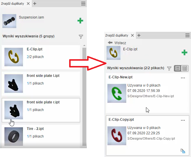 Kliknij żądany wynik grupy, aby wyświetlić poszczególne zduplikowane części.
