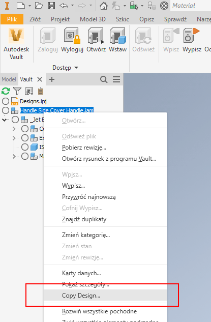 - W programie Inventor kliknij prawym przyciskiem myszy plik w przeglądarce programu Vault, a następnie kliknij polecenie Copy Design.