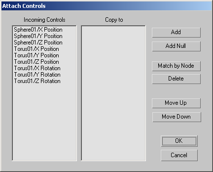 A lista Controles de Entrada à esquerda contém todas as trilhas que estão chegando. A lista Copiar Para à direita contém todas as trilhas da cena atual às quais você fará a anexação.