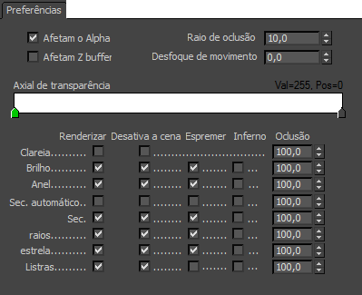 Especifica se o reflexo de luz da lente afeta ou não o canal alfa de uma imagem, quando a imagem é renderizada em um formato de arquivo de 32 bits. O canal alfa é um adicional de 8 bits de cor (256 cores) que indicam a transparência em uma imagem. Os canais alfa são utilizados para compor uma imagem diretamente sobre o topo da outra. Se você deseja compor o reflexo de luz de uma lente ou uma imagem que contém um reflexo de luz de uma lente, sobre a parte superior da outra imagem, ative esta opção. Se você não estiver renderizando um arquivo de 32 bits, não ative essa opção.