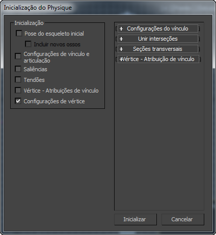 Utilize o comando Reinitialize em Physique para redefinir um atributo específico de um comportamento de pele de caractere. Entre as utilizações comuns estão as resetting bulges, deleting tendons, reing vertex-link ments ou reing the biped relative to the attached mesh. Basicamente, é possível reinicializar para redefinir todos ou um único item no grupo Initialization.