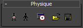 Utilize os botões na implementação de físico para vincular uma malha para um bípede, uma hierarquia de ossos, ou uma spline; para reinicializar os parâmetros de físico em uma malha; para abrir o Editor de convexidade; e a carga ou salvar arquivos físicos (PHY).