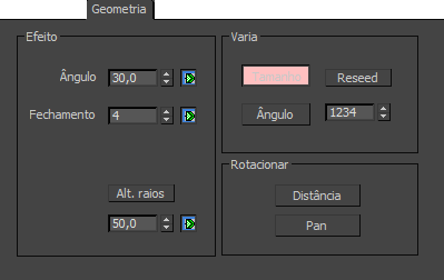 O painel Geometria é onde você define a rotação inicial dos realces, bem como os elementos são afetados ao longo do tempo. O painel Geometria é composto por três áreas: Efeito, Variar e Rodar.