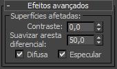 - O aumento do valor da opção Suavizar aresta difusa suaviza as arestas entre as partes difusas e ambiente de uma superfície. Isso ajuda a eliminar arestas que podem aparecer em uma superfície em determinadas circunstâncias. Padrão=50.