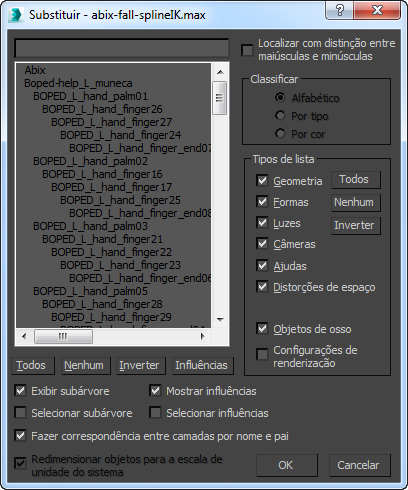 Quando você escolhe Substituir, uma caixa de diálogo do selecionador de arquivo padrão é exibida. Utilize o seletor de arquivo para escolher o arquivo de cena com os objetos de substituição. Após clicar em Abrir, a caixa de diálogo Substituir é exibida.