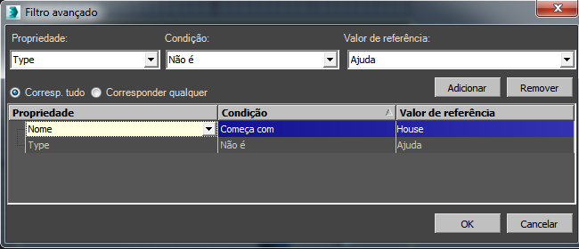 Por exemplo, se você quiser mostrar somente os objetos diferentes dos objetos de Ajuda cujo nome comece com "House", sua configuração deverá se parecer com esta: