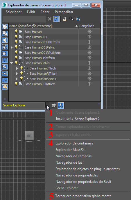 - Lista de todos os Scene Explorers locais: aparece somente quando existem Scene Explorers locais. Neste exemplo, o Local Scene Explorer 1 está esmaecido, o que indica que ele já está aberto em uma caixa de diálogo separada. Entretanto, o Local Scene Explorer 2 está disponível para clicar, o que significa que ele está fechado, portanto, a ação de clicar em seu nome substitui a caixa de diálogo pelo Local Scene Explorer 2. Esse procedimento faz com que o menu Ferramentas