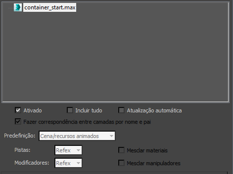 - Recursos de cena/animados (Padrão.) Faz referências de dados de geometria e de animação. As atualizações de material são armazenadas na cena local. As atualizações do arquivo de origem na geometria ou animação podem ser herdadas pela cena local.