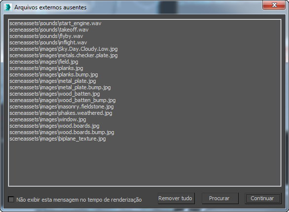 - Somente aparece no momento da renderização. Quando ativada, o 3ds Max não exibe a caixa de diálogo na próxima vez que os arquivos externos não forem encontrados.
