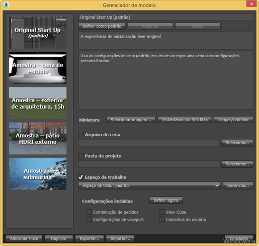 - Define o modelo ativo como o padrão para futuras sessões do 3ds Max.
