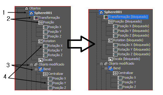 O bloqueio de uma trilha principal também bloqueia todas as trilhas secundárias. Por exemplo, se você bloquear a trilha de transformação/rotação de um objeto, suas trilhas de rotação X/Y/Z são bloqueadas também (assumindo o padrão Euler do controlador de rotação XYZ), portanto, impedindo que o objeto seja rotacionado.