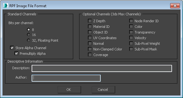 Quando o formato de saída escolhido for o RLA, clique em Renderizar ou Configurar na caixa de diálogo Arquivo de saída de renderização que exibe a caixa de diálogo Formato de arquivo de imagem RLA.