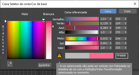 Quando o usuário utiliza o gerenciamento de cores com base em OCIO e define as cores no espaço de Cena, os controles deslizantes indicam as cores que não podem ser reproduzidas na sua tela usando listras pretas. Também é possível selecionar essas cores, e a exibição mostrará a cor de tela mais próxima possível. Além disso, é exibido um símbolo de aviso — passe o cursor do mouse sobre o ícone para ver se a cor está fora da gama de exibição, da gama de renderização ou de ambas.