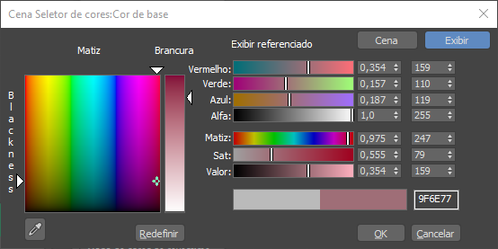 É possível utilizar o Seletor de cores para especificar diferentes parâmetros de cor, inclusive cores de luz, materiais, plano de fundo e objetos personalizados. Você pode definir valores no espaço de renderização ou de exibição usando três modelos de cores diferentes para concentrar o foco na cor exata desejada.
