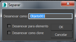 Por padrão, Desanexar para elemento e Desanexar como clone estão desativadas. Assim, quando você desanexa uma seleção de subobjeto, é removida do objeto original e torna-se um novo objeto. As opções da caixa de diálogo permitem manter o item desanexado como um elemento do objeto original e/ou desanexá-lo como uma cópia da seleção original.
