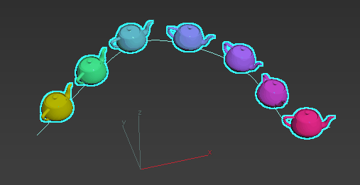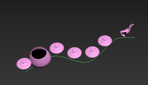 - Distribui clones ao longo de uma spline de destino, colocando um clone em cada nó. Quando nós específicos são selecionados, os clones são colocados somente nesses nós selecionados.