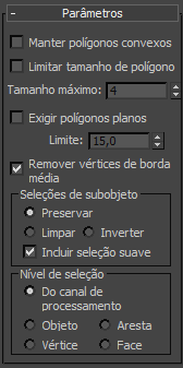 - Do canal utiliza o equivalente de tudo que o objeto de entrada usa (o nível de patch se torna nível de face e assim por diante). Por exemplo, quando se cria uma caixa, ela é convertida em uma malha editável no modo de face e se aplica o modificador Transformar em polígono, o 3ds Max passa a seleção de subobjeto no modo de face para cima na pilha. O modificador Transformar em poligonal leva em conta a seleção de face de subobjeto e seleciona os polígonos que derivam da seleção de face.