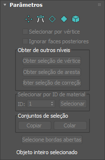 Os ícones na parte superior da seleção suspensa permitem especificar o método de seleção de face. Clicar em um botão daqui é o mesmo que selecionar um tipo de subobjeto na pilha modificadora. Clique no botão novamente para desativar e retornar para o nível de seleção de objetos.