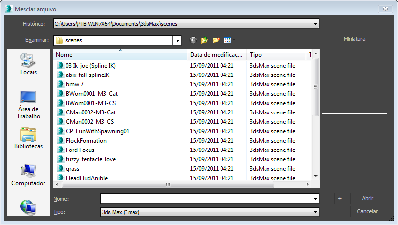 Na caixa de diálogo de seleção de arquivo padrão, selecione o arquivo de cena para mesclar. Só é possível mesclar arquivos MAX.