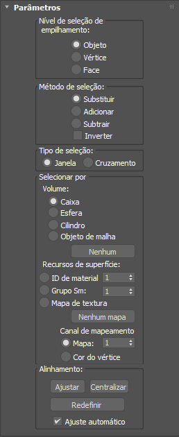 Estes controles permitem definir a seleção com um primitivo, um objeto de malha, ou por características de superfície.