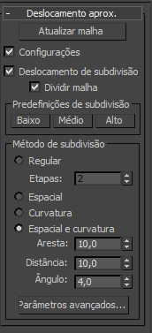 Quando desativado, o Displace Mesh usa as configurações padrão para subdividir a malha para propósitos de mapeamente de deslocamento. Quando ativados, os controles de subdivisão nessa implementação são habilitados. Padrão=desativado.