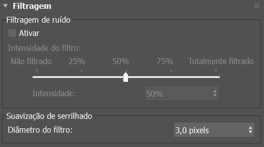 A implementação Filtragem contém configurações para controlar o ruído e a suavização para o agente de renderização ART.