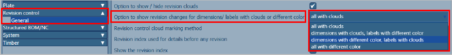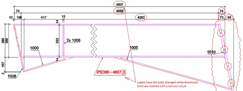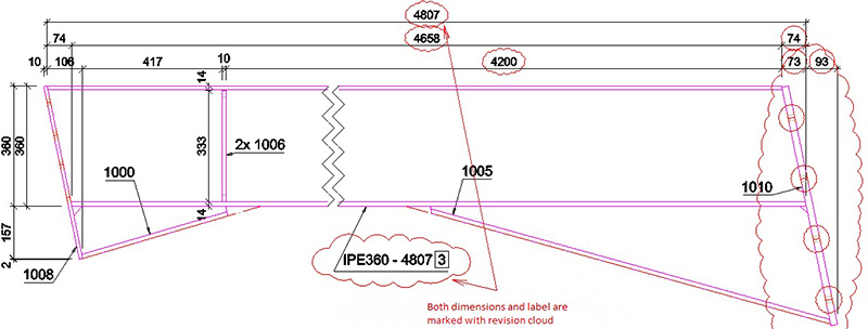 When a drawing is updated with revision, the revision changes can be marked with clouds around the objects that were modified in the model. In addition to the revision marking of the modified object, it is possible to display revisions around dimension lines and labels which change their content during update.