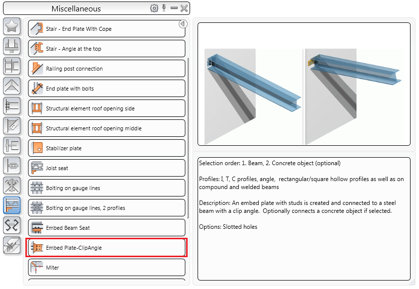 The Embed Plate-ClipAngle joint can be used only between specific types of concrete elements (wall, slab, beam) and some of the steel sections (I, T, C, L, welded, compound or tapered sections).