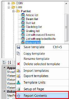 - For example, right click on "Material List" and select Report Contents from the context menu.