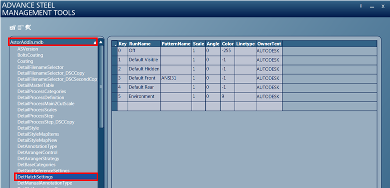 - After configuring the hatch, close the Management Tools and use the "Update defaults" function in Advance Steel to include the modification.