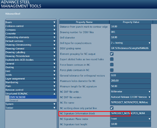- Select that Option and you will see the dialog change to show the Value currently available. The current default is set just to show the part number of the component, either the single or Main part depending on the NC settings options set within Advance Steel ( files can run for either single or main parts). It is possible to add additional tokens to this Value and in this instance we can add "%PROJECT_NO". This corresponds to the Project number set in the