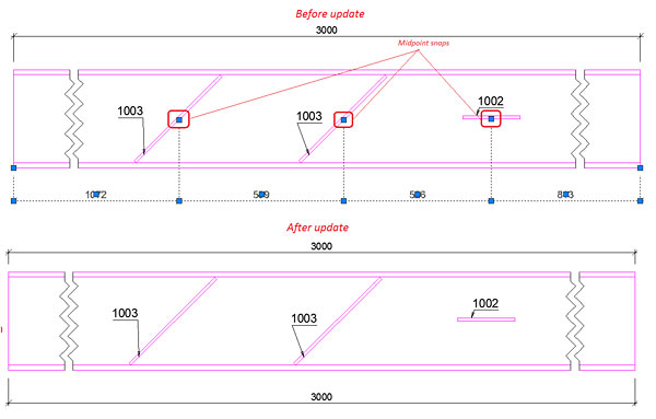 Any additional hole/bolt center snap points chosen from in between the extremities, as long as we do not choose all of them (see next point), are removed during update without affecting the correct snap points.