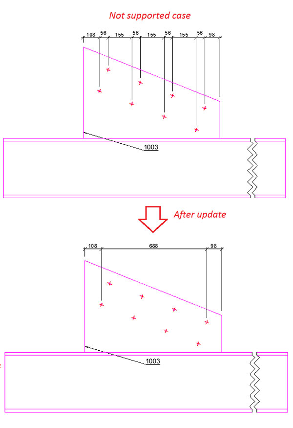 If there is more than one hole/bolt at one extremity, then any of them is supported, and the dimension line does not change to a similar hole during update.