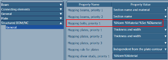 For example, if you need for each different bolt class, material, set and diameter to get a different mapping, you need to set the default that controls the priority as follows: %Norm %Material %Set %Diameter.